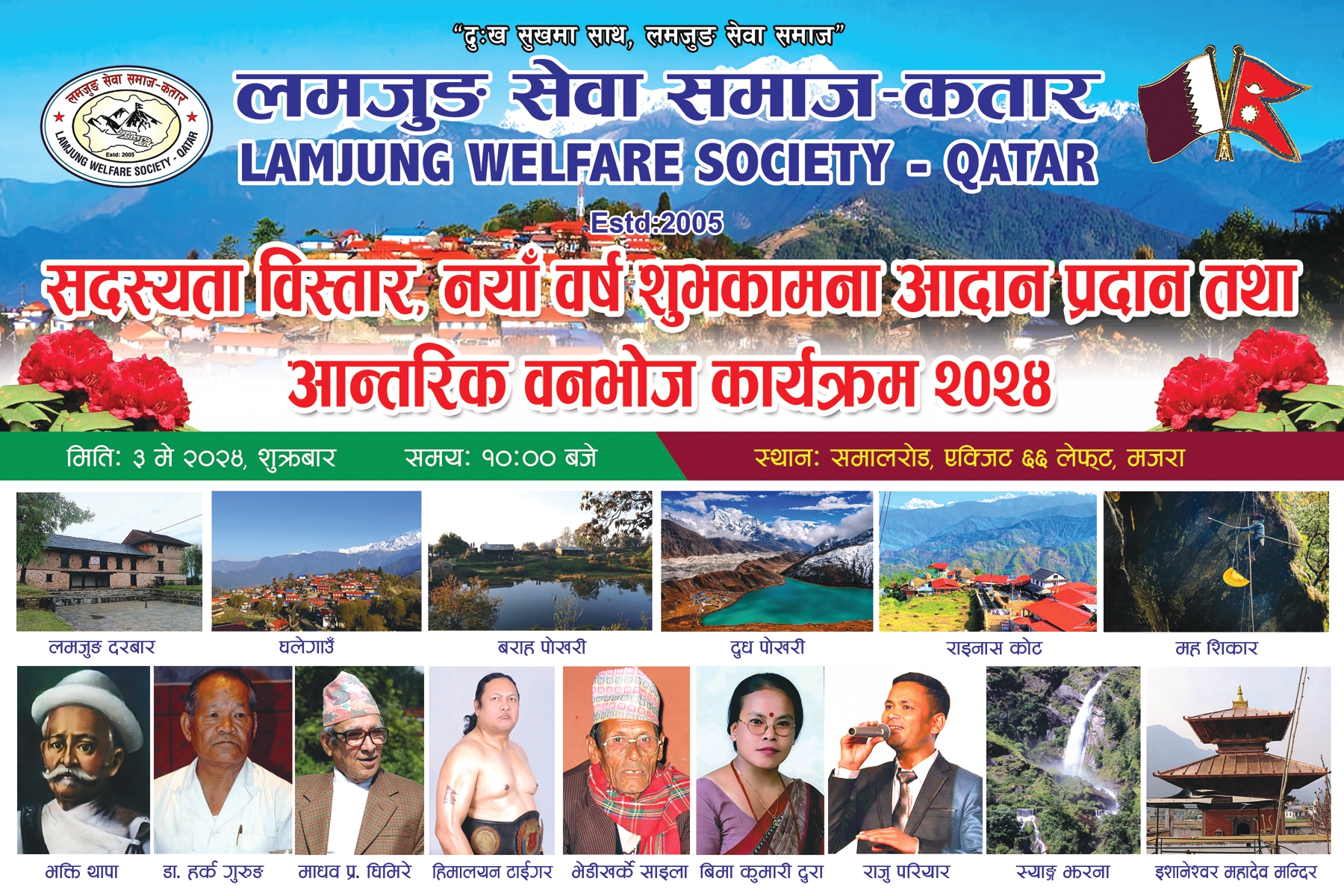 लमजुङ सेवा समाज कतारले मे ३ मा सदस्यता विस्तार, नयाँबर्ष २०८१ सालको शुभकामना आदानप्रदान तथा आन्तरिक वनभोज कार्यक्रम गर्ने भएको छ ।